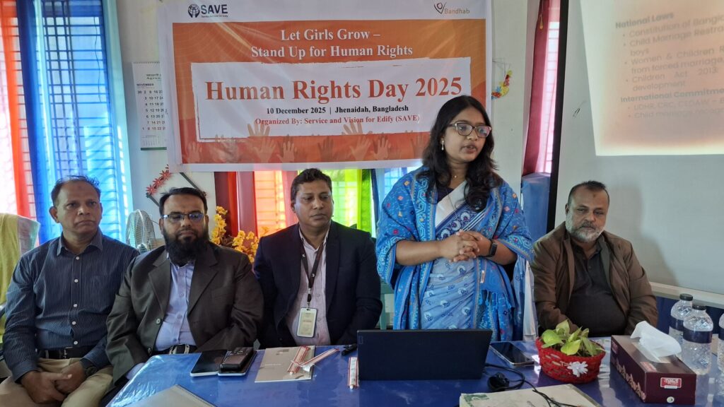আন্তর্জাতিক মানবাধিকার দিবস উপলক্ষে ঝিনাইদহে বাল্যবিবাহ প্রতিরোধ বিষয়ক সচেতনতামূলক সভা অনুষ্ঠিত হয়েছে। বুধবার সকালে শহরের পাবলিক লাইব্রেরির পদ্মা ট্রেনিং সেন্টারে বেসরকারি সংস্থা সারভিস এন্ড ভিশন ফর এডিফাই (সেইভ) এ সভার আয়োজন করে।